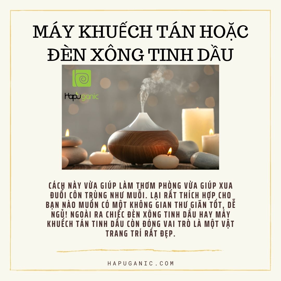 Cách này vừa giúp làm thơm phòng vừa giúp xua đuổi côn trùng như muỗi. Lại rất thích hợp cho bạn nào muốn có một không gian thư giãn tốt, dễ ngủ! Ngoài ra chiếc đèn xông tinh dầu hay máy khuếch tán tinh dầu còn đóng vai trò là một vật trang trí rất đẹp.