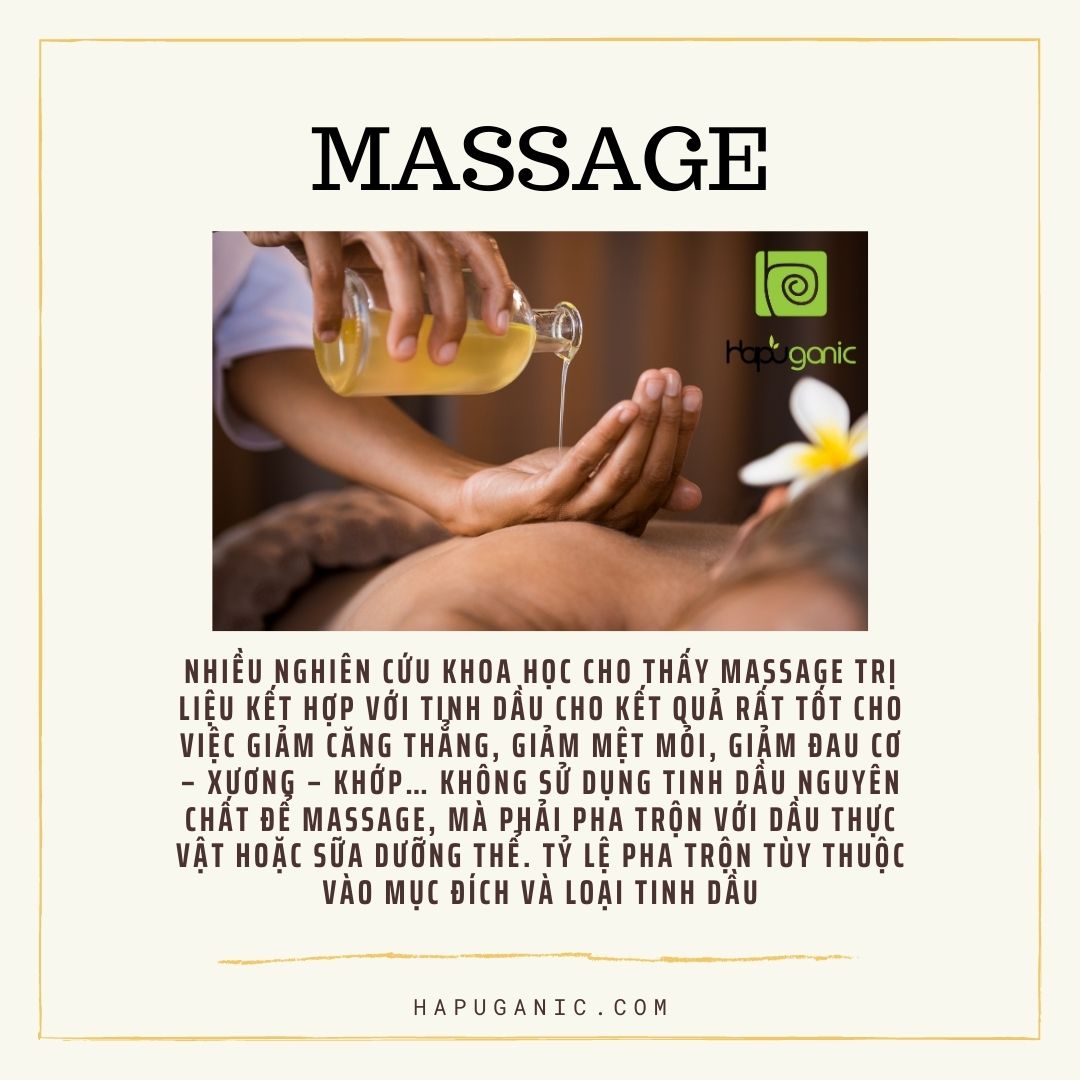 - Không sử dụng tinh dầu nguyên chất để massage, mà phải pha trộn với dầu thực vật hoặc sữa dưỡng thể. Tỷ lệ pha trộn tùy thuộc vào mục đích và loại tinh dầu