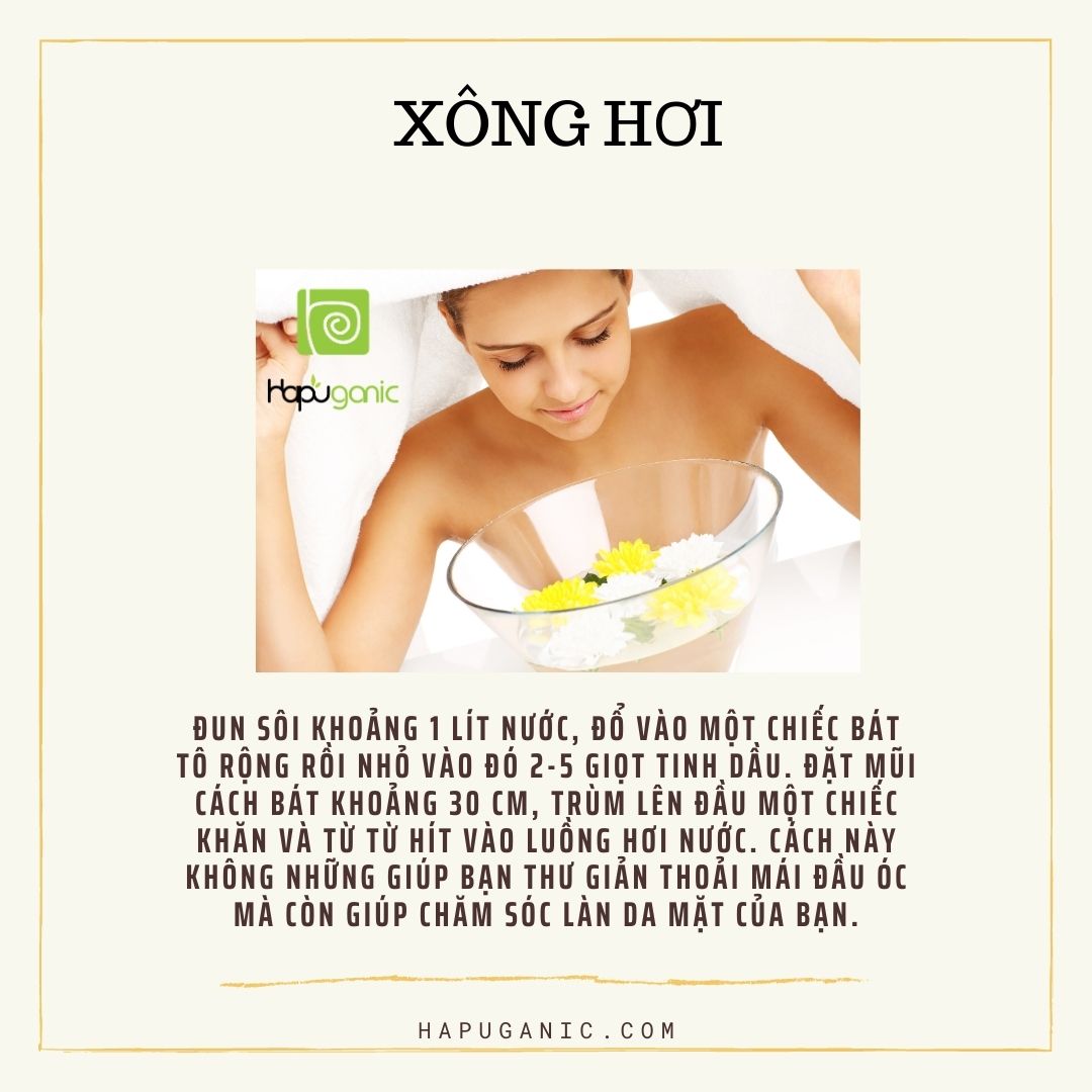 Đun sôi khoảng 1 lít nước, đổ vào một chiếc bát tô rộng rồi nhỏ vào đó 2-5 giọt tinh dầu. Đặt mũi cách bát khoảng 30 cm, trùm lên đầu một chiếc khăn và từ từ hít vào luồng hơi nước. Sau đó thì thư giãn đi nào! Cách này không những giúp bạn thư giản thoải mái đầu óc mà còn giúp chăm sóc làn da mặt của bạn.