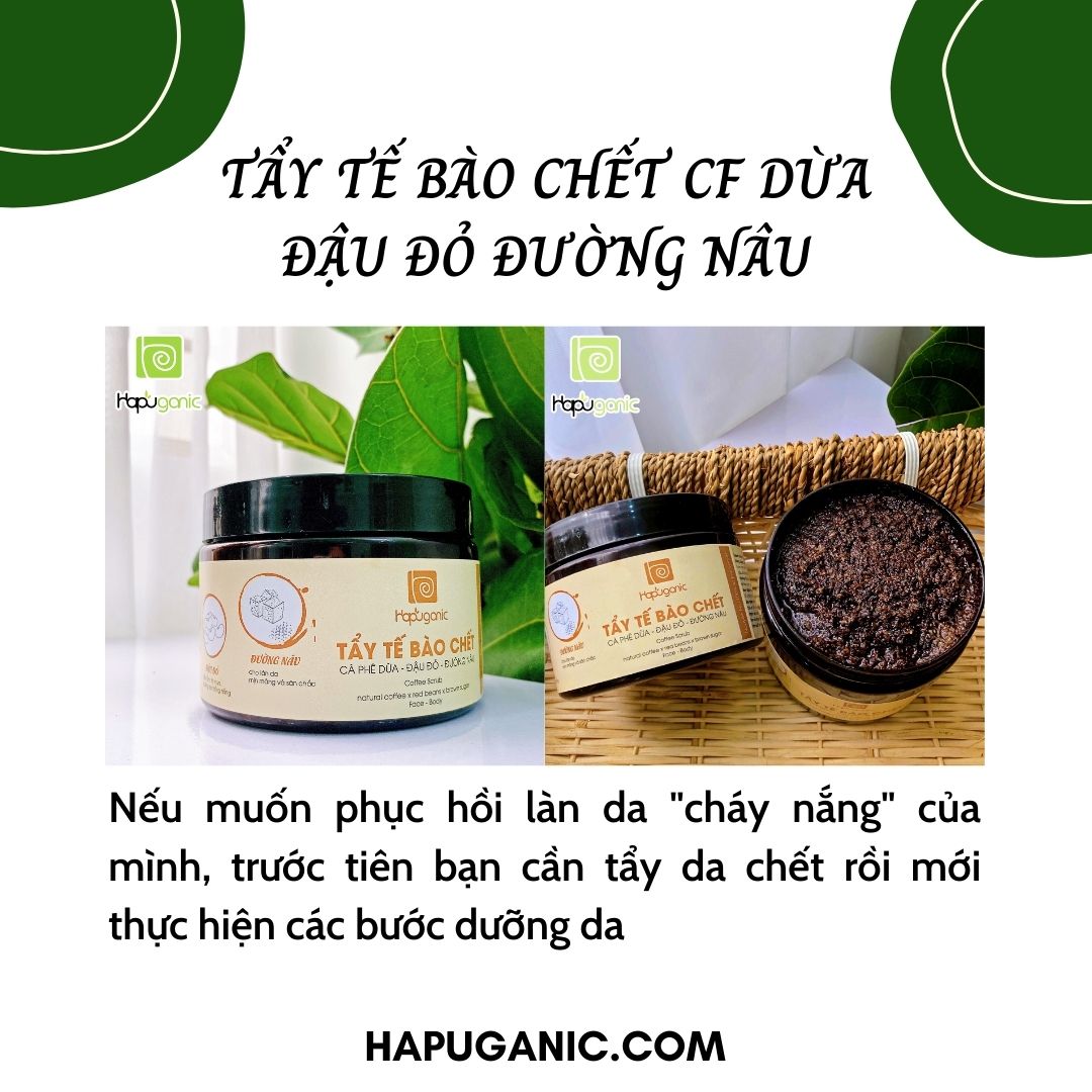 Nếu muốn phục hồi làn da "cháy nắng" của mình, trước tiên bạn cần tẩy da chết rồi mới thực hiện các bước dưỡng da. Với sản phẩm tẩy tế bào chết cà phê dừa đậu đỏ đường nâu thiên nhiên nhà HaPu Organic thì làn da khách vừa được làm sạch vừa được rửa trôi những bụi bẩn bám lâu ngày mà còn bổ sung dưỡng chất rất nhiều cho làn da mềm mịn.
